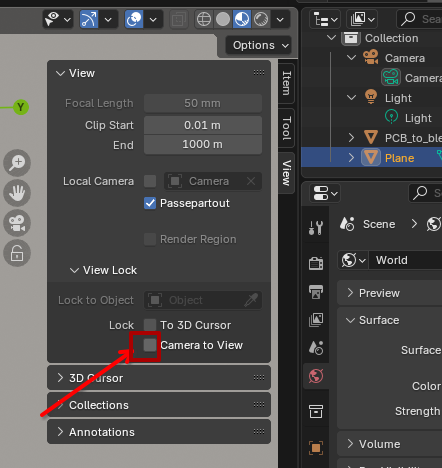 4. Enable Camera to View so you can adjust the camera like a viewport.