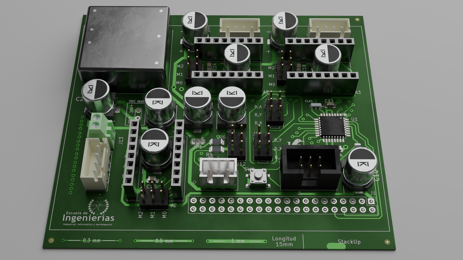 The shield was designed from scratch with the goal of powering the entire system from a single source, simplifying both wiring and deployment. It handles the control of stepper motors, endstops, and servos, and establishes communication with the Raspberry Pi through GPIO, offering compatibility with multiple machine types — including 2D plotters, 3D printers, and light-duty CNCs.